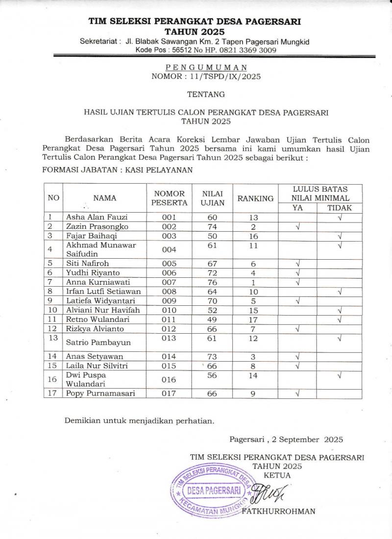 PENGUMUMAN HASIL TES SELEKSI PERANGKAT DESA
