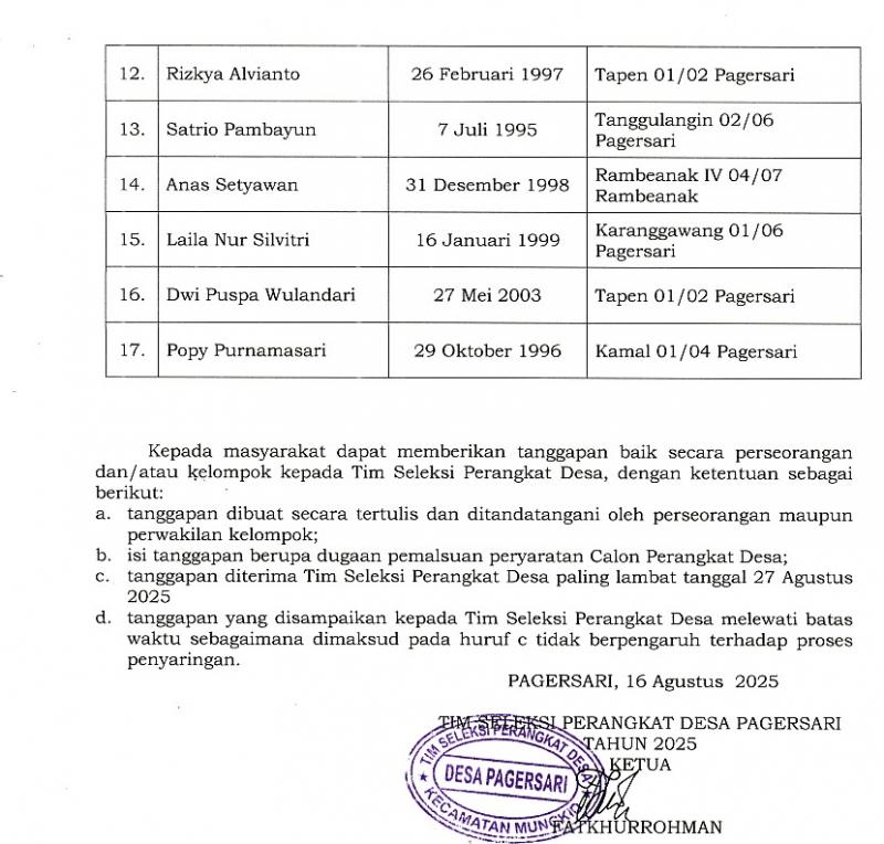 Bersama ini kami umumkan hasil penelitian persyaratan Bakal Calon Perangkat Desa Pagersari Tahun 2025 sebagai berikut :