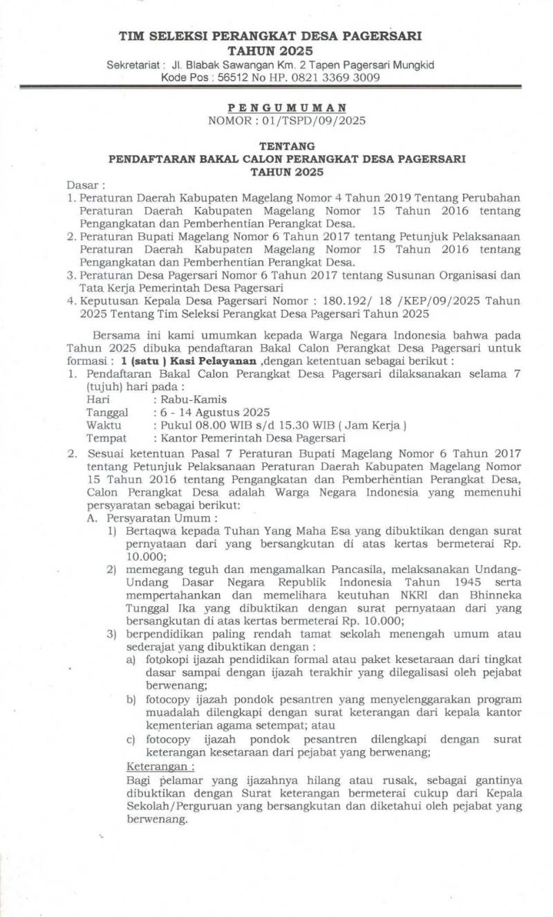 Sesuai Perdes Pagersari Nomor 6 Tahun 2017 Tentang SOTK Pemdes Pagersari dan adanya kekosongan Jabatan Kasi Pelayanan Maka Pemerintah Desa Pagersari telah membentuk Tim Seleksi Perangkat Desa Pagersari Tahun 2025 untuk melaksanakan tahapan Pengisian Perangkat Desa.