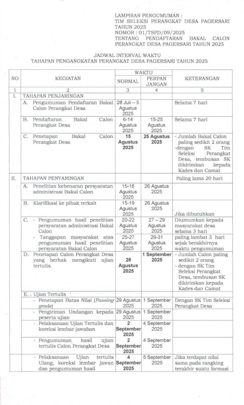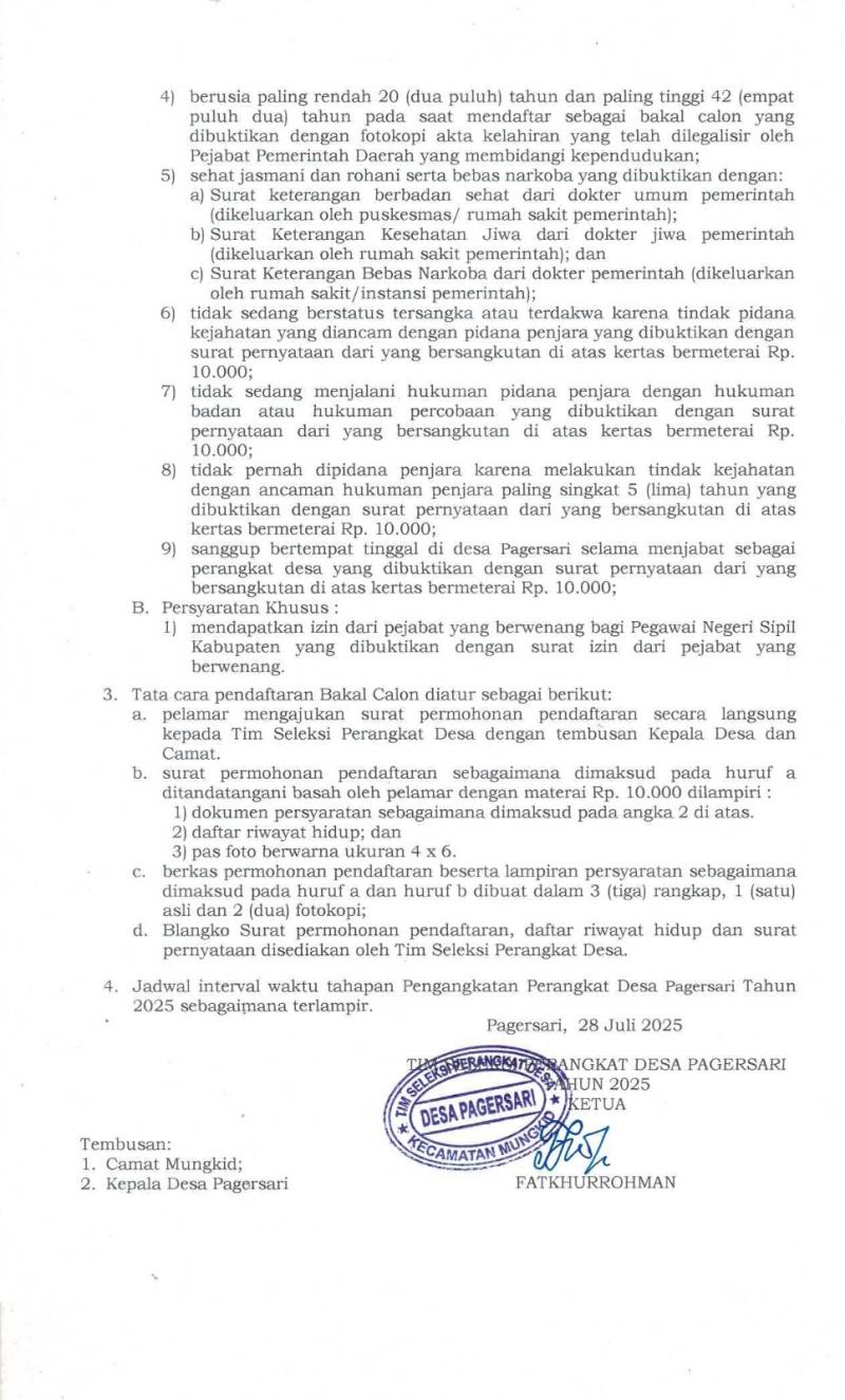 Pendaftaran bakal calon perangkat desa dimulai tanggal 6 Agustus 2025 sampai dengan Tanggal 14 Agustus 2025 pada jam kerja. Persyaratan dan ketentuan sesuai dengan peraturan perundangan yang berlaku.