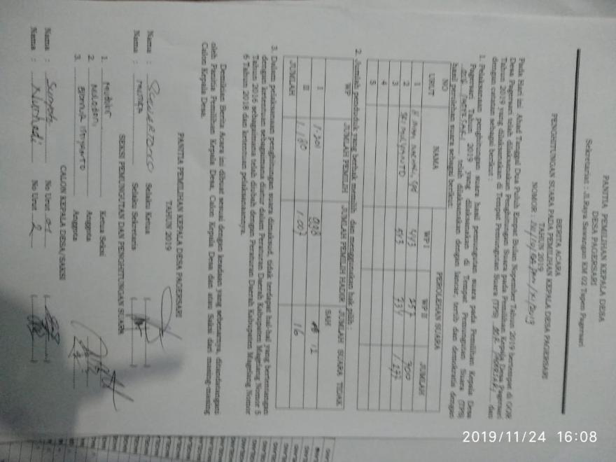 Cakades Nomor urut 1 Bapak H. Imam Machali memperoleh 700 suara.Cakades Nomor urut 2 Bapak Sri Mulyanto memperoleh 1.277 suara, Dan 26 suara dinyatakan tidak sah,